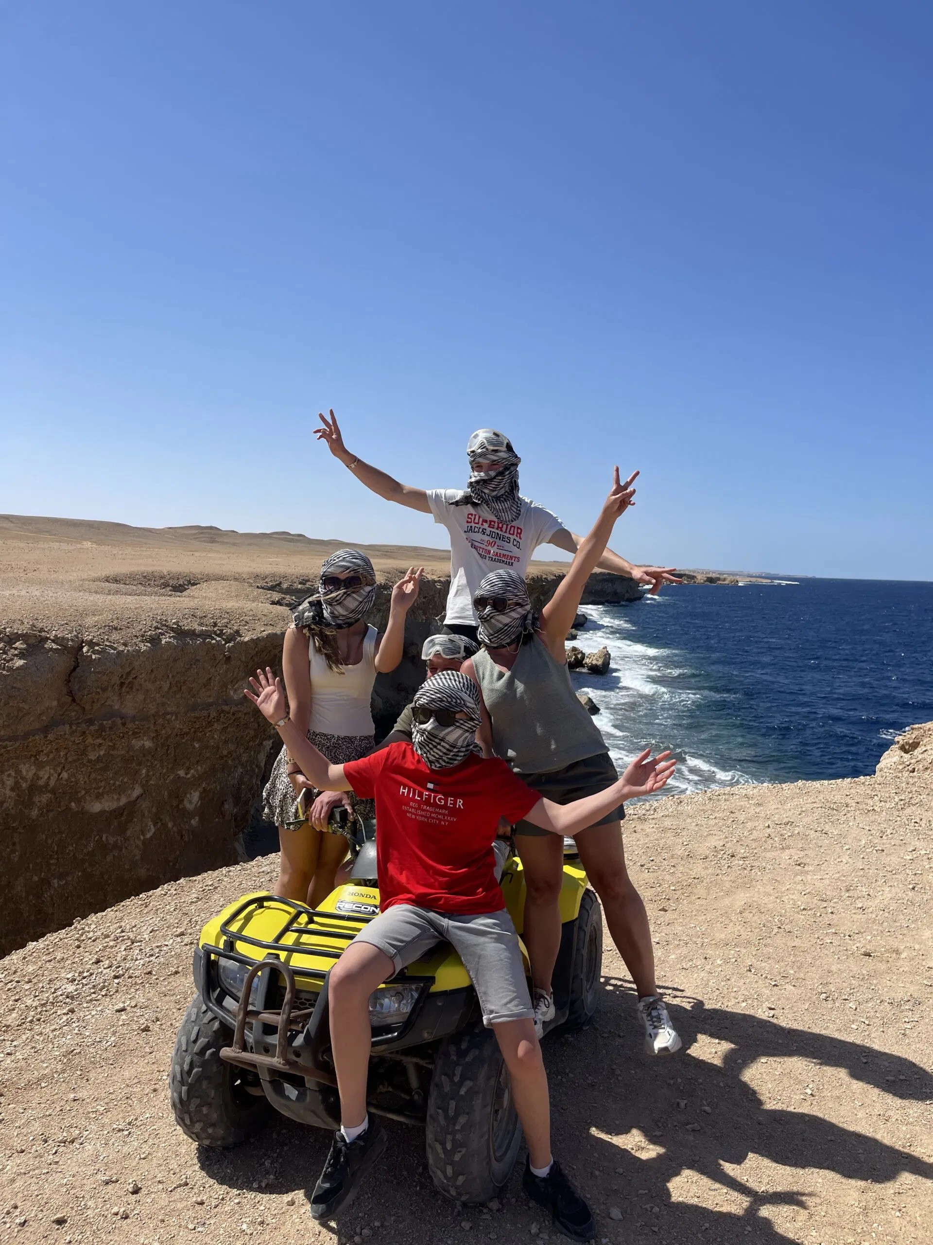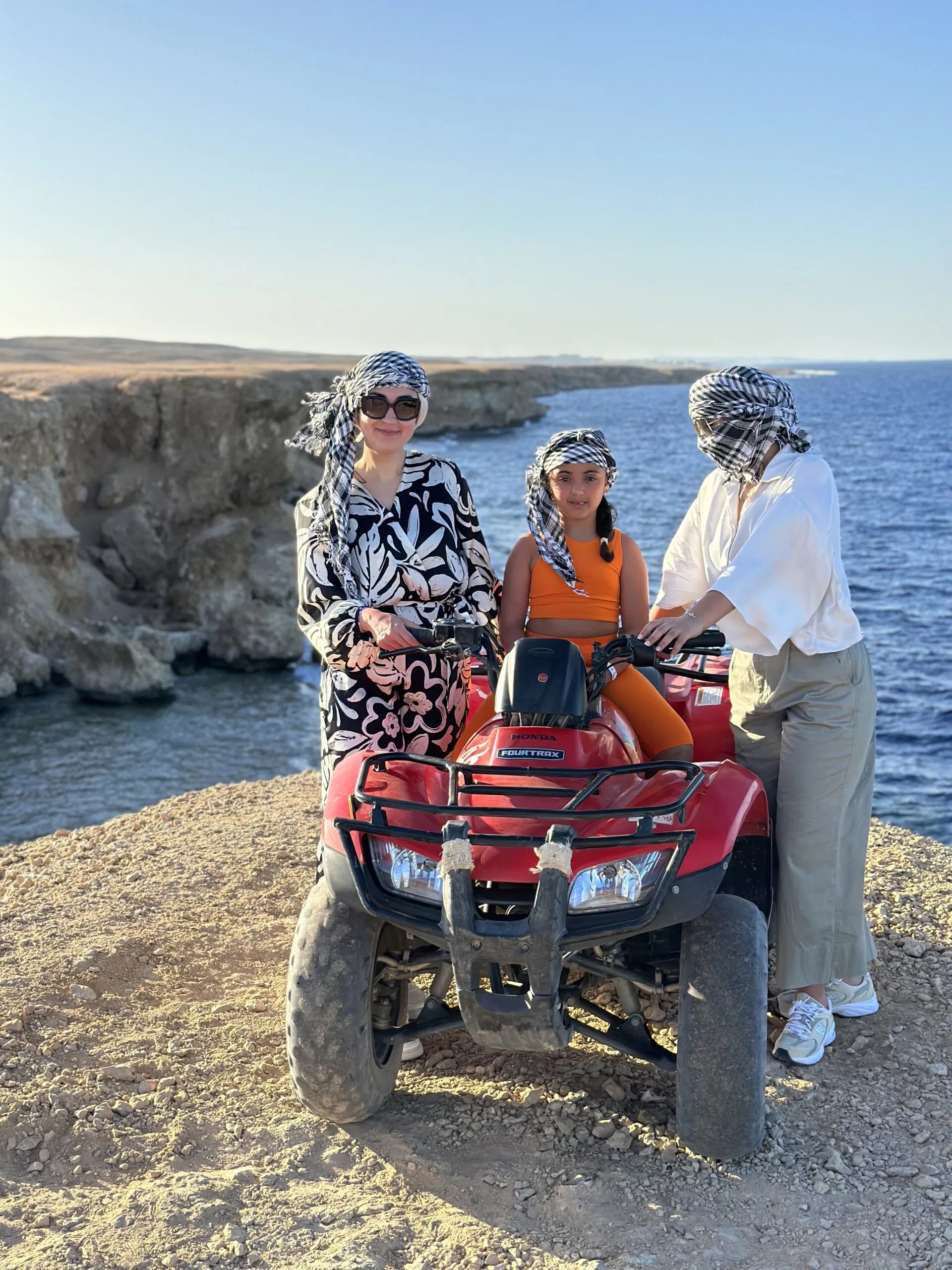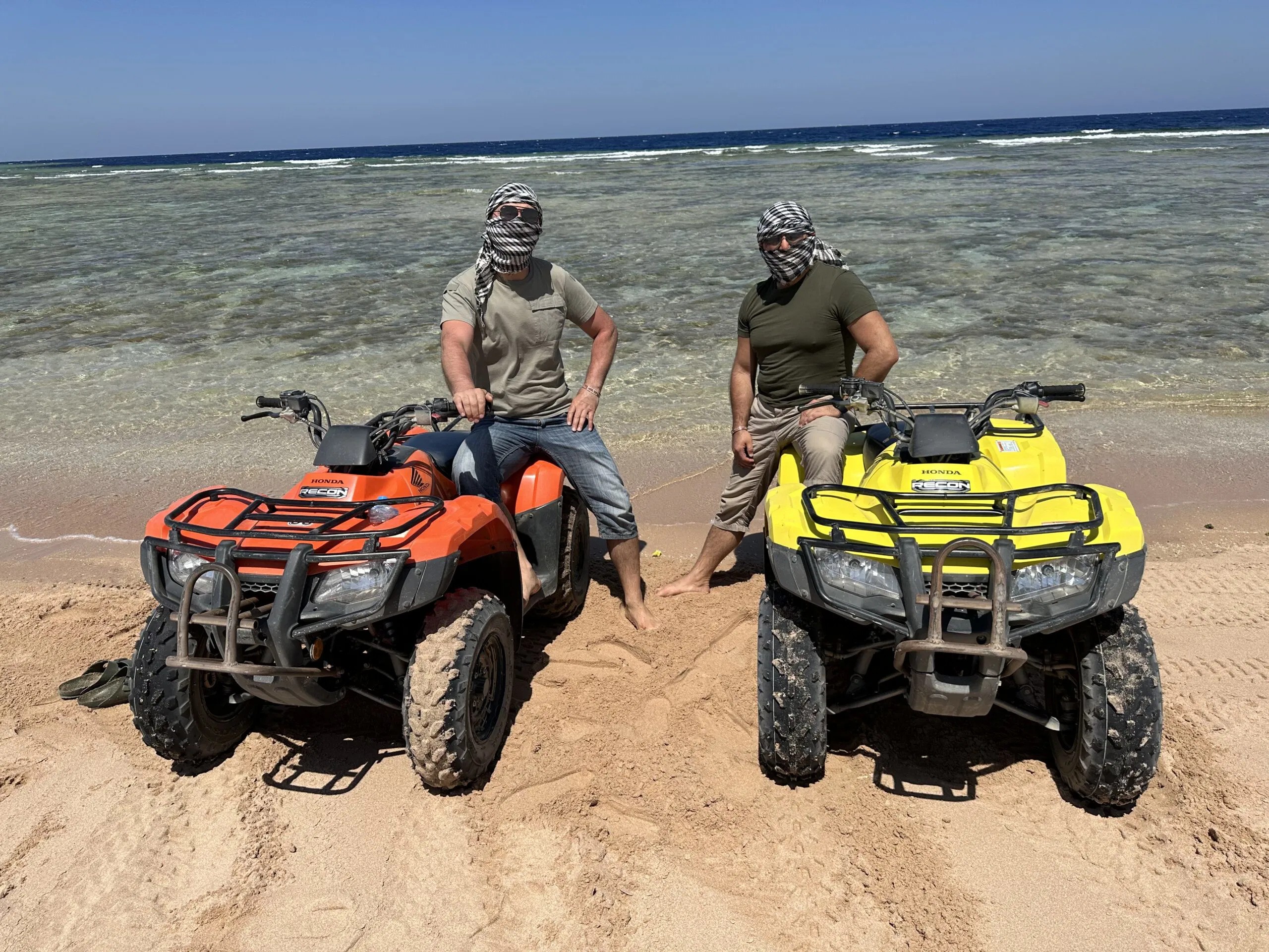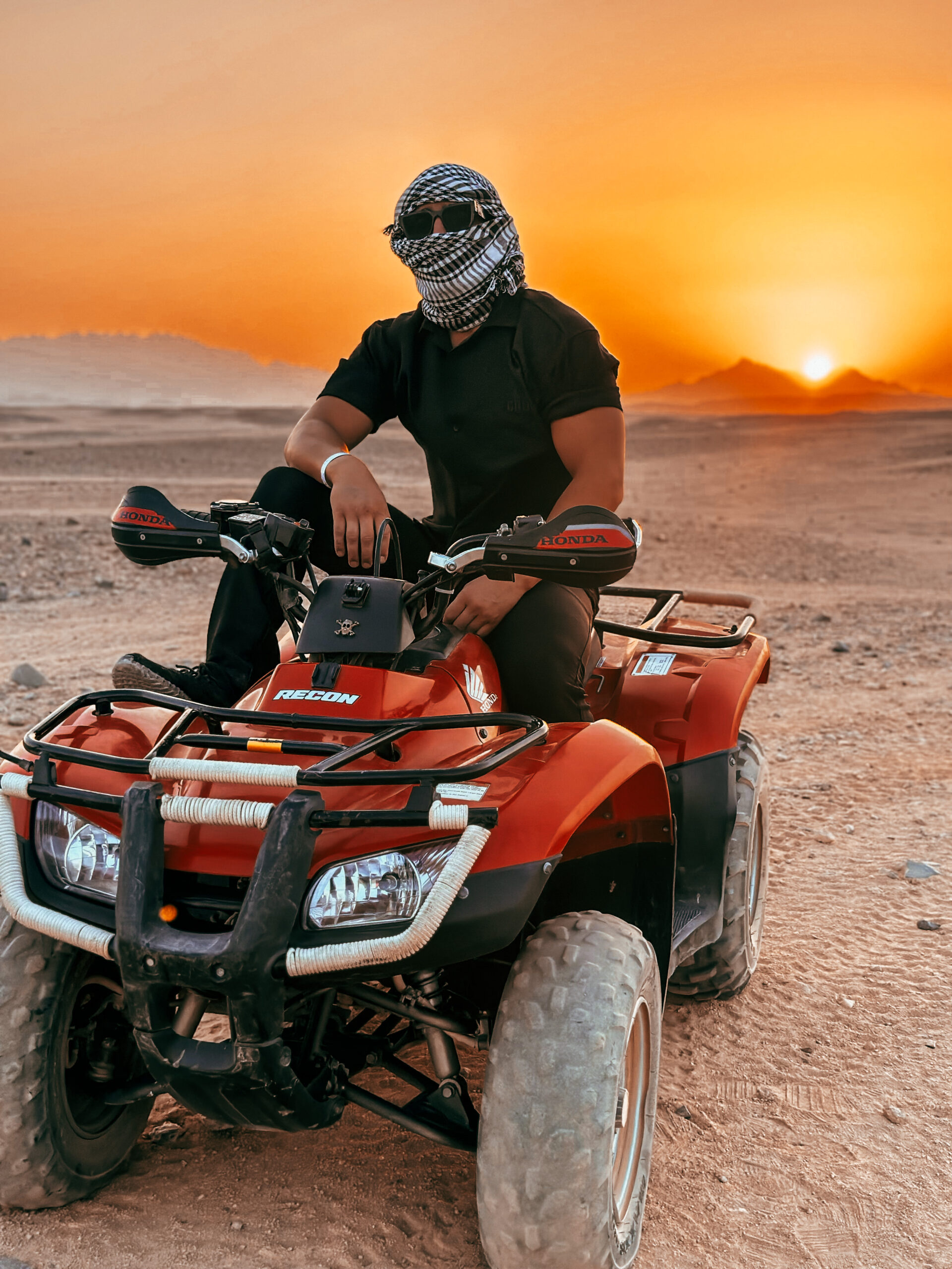 Around 13:30 or 14:00 PM, you will be picked up and driven to the safari station in an air-conditioned bus. After putting on your helmet and hearing a briefing, you embark on a three-hour quad bike journey through the multicolored sands to explore the desert and stop sometimes for pictures in the breathtaking Marsa Alam desert.