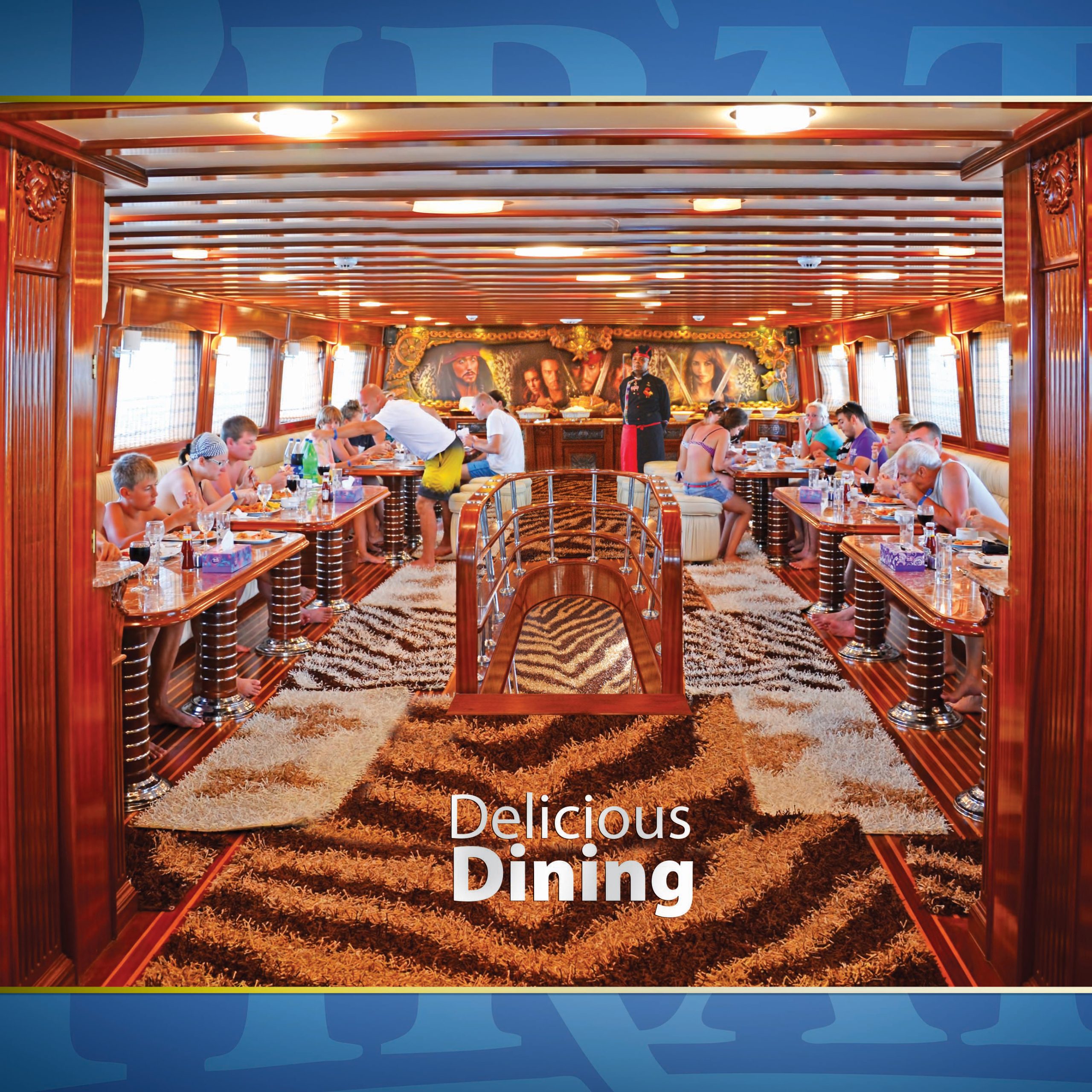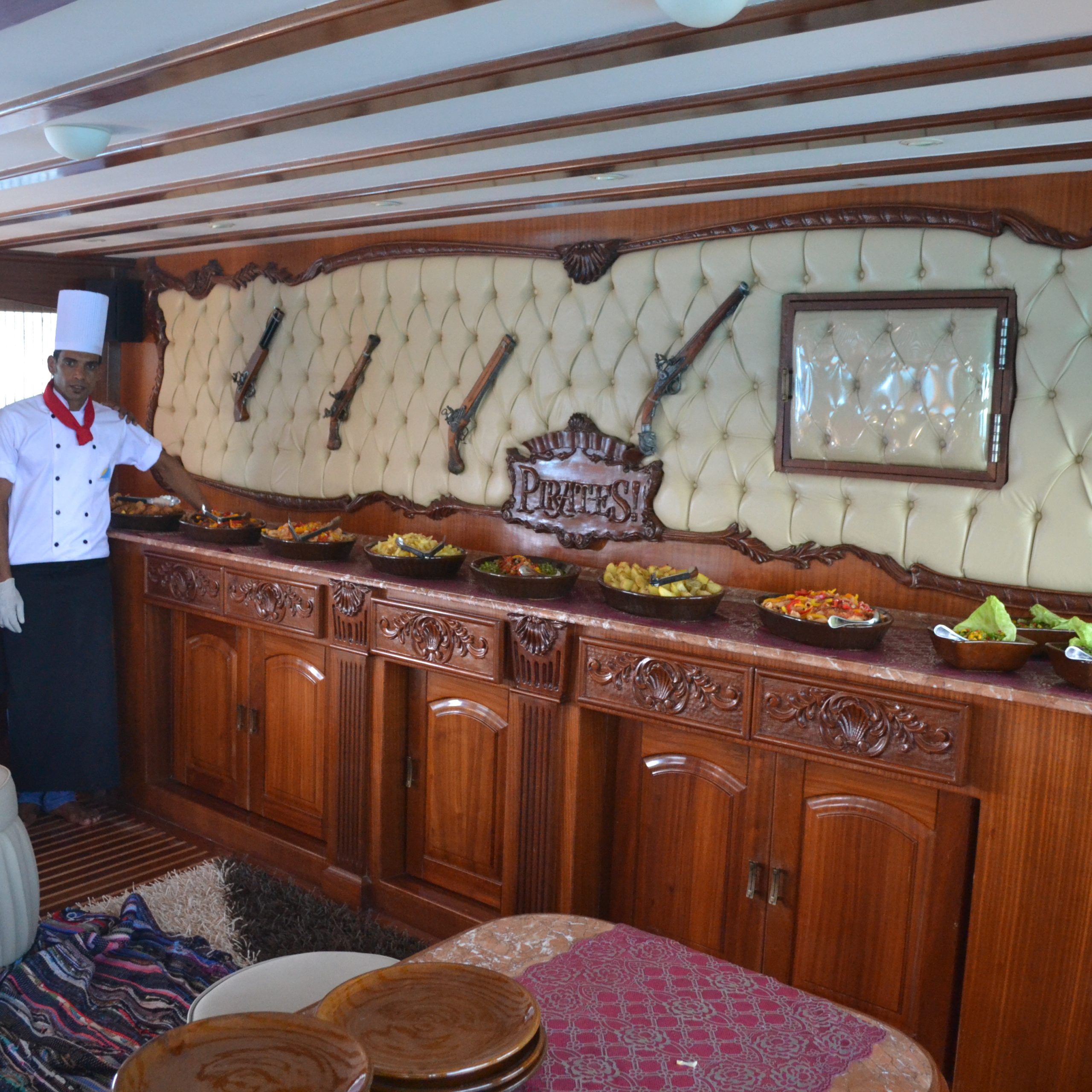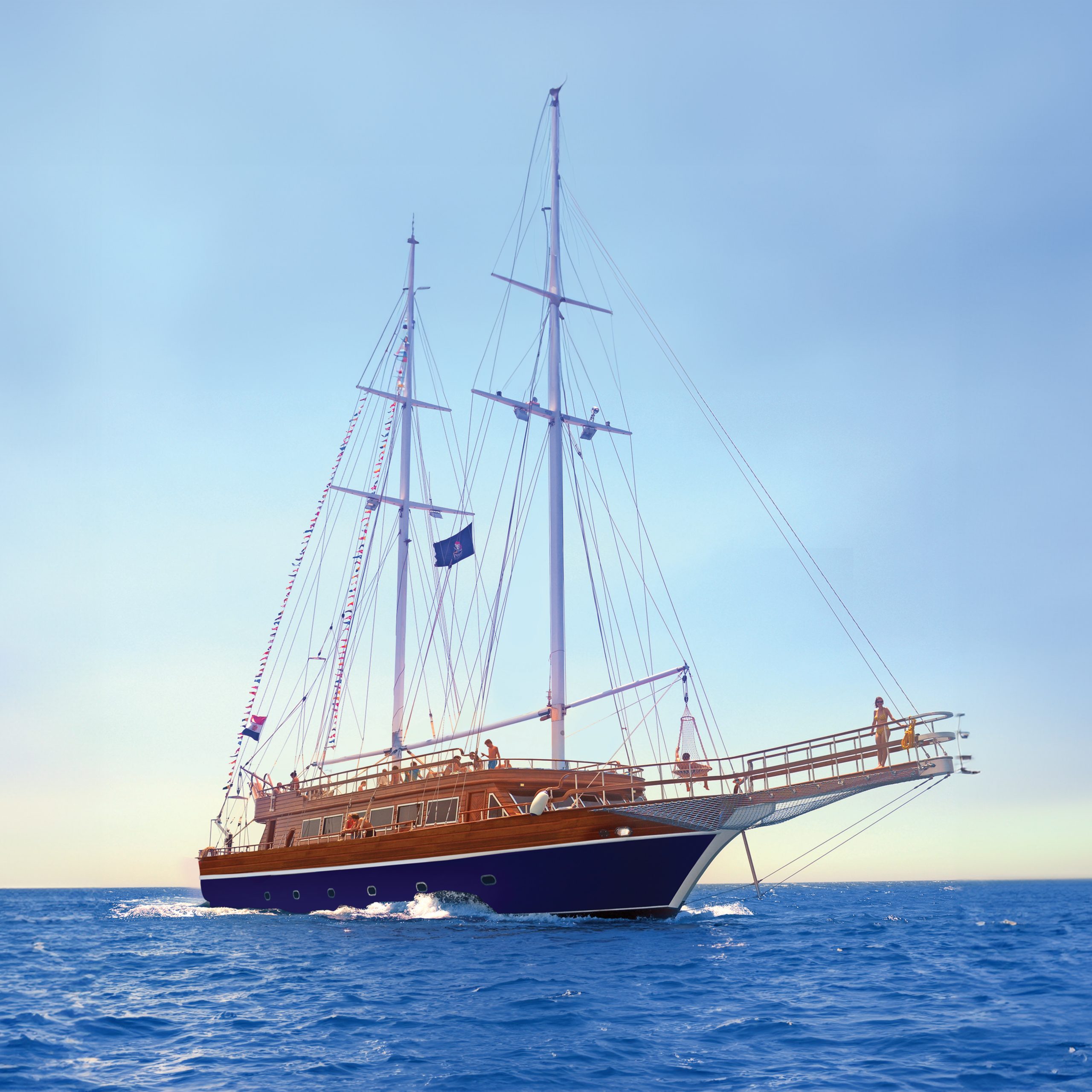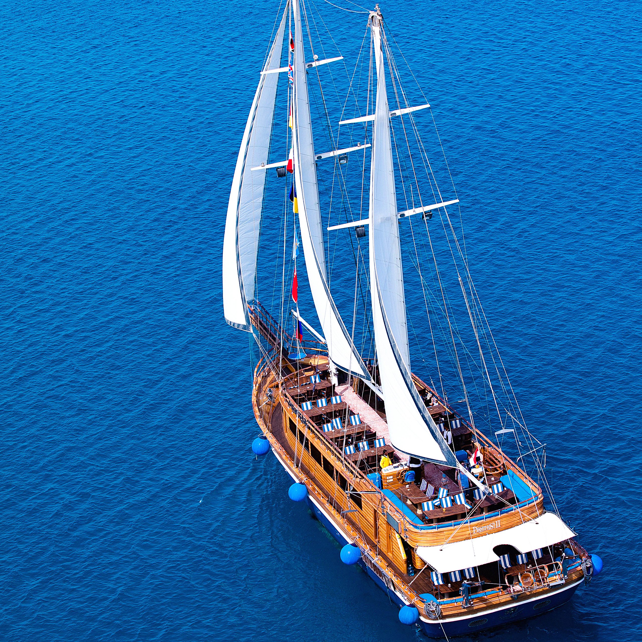 The Pirates yachts are two-masted, wooden vessels that evoke the heyday of sailing. They have a large, air-conditioned top sun deck and two lower deck salons that are lavishly furnished in wood and marble and exquisitely adorned with a pirate motif. Your onboard banquet open buffet lunch is provided in the salon.
