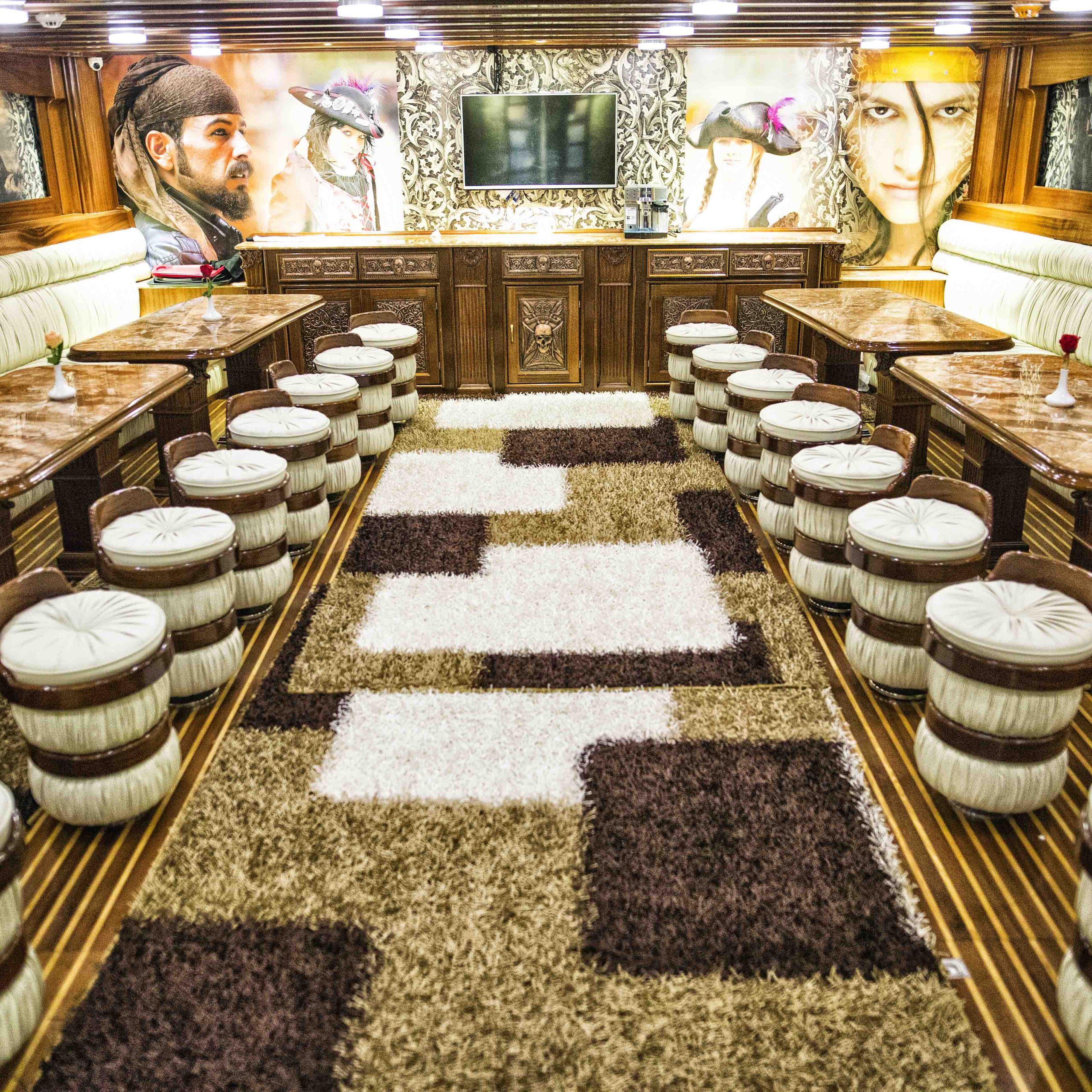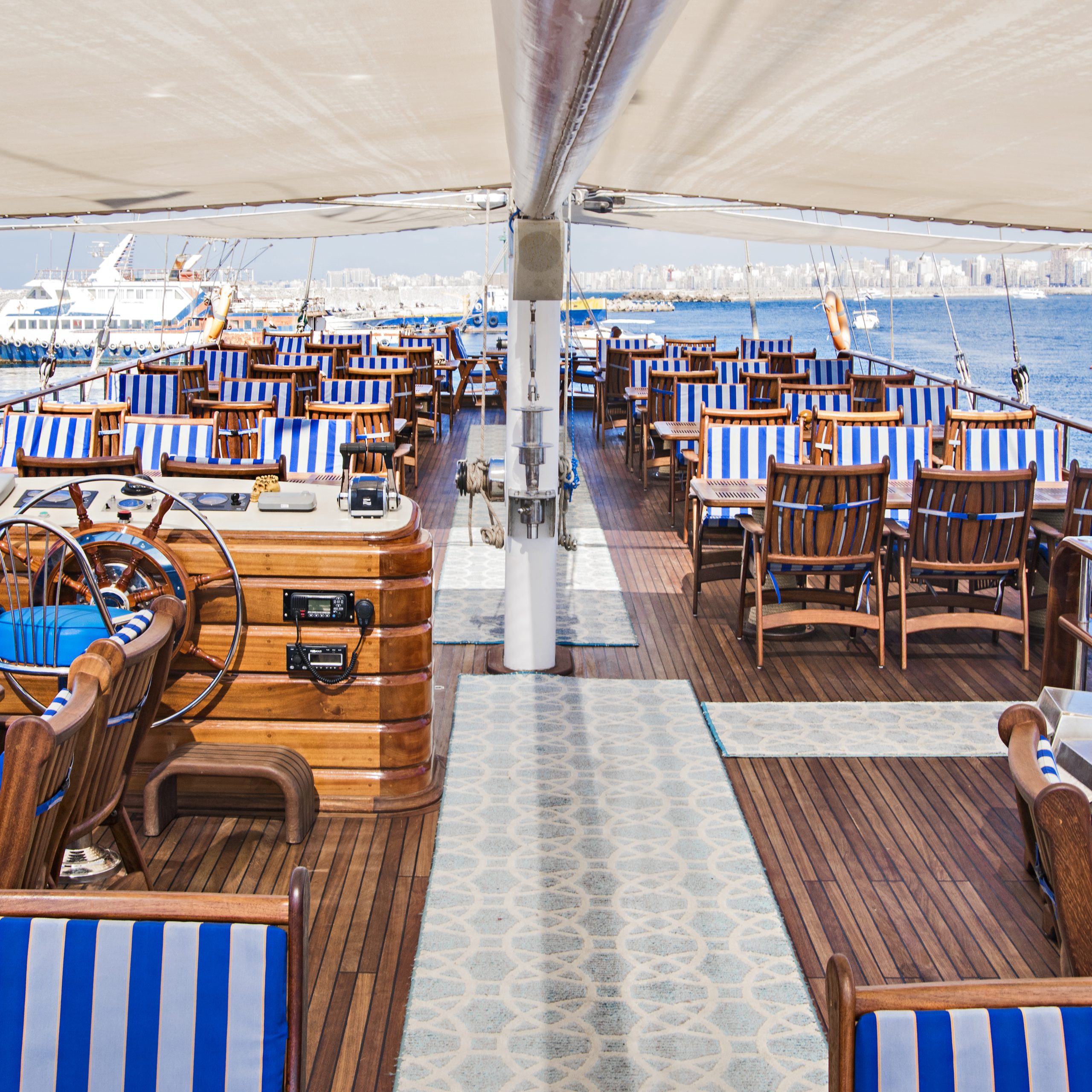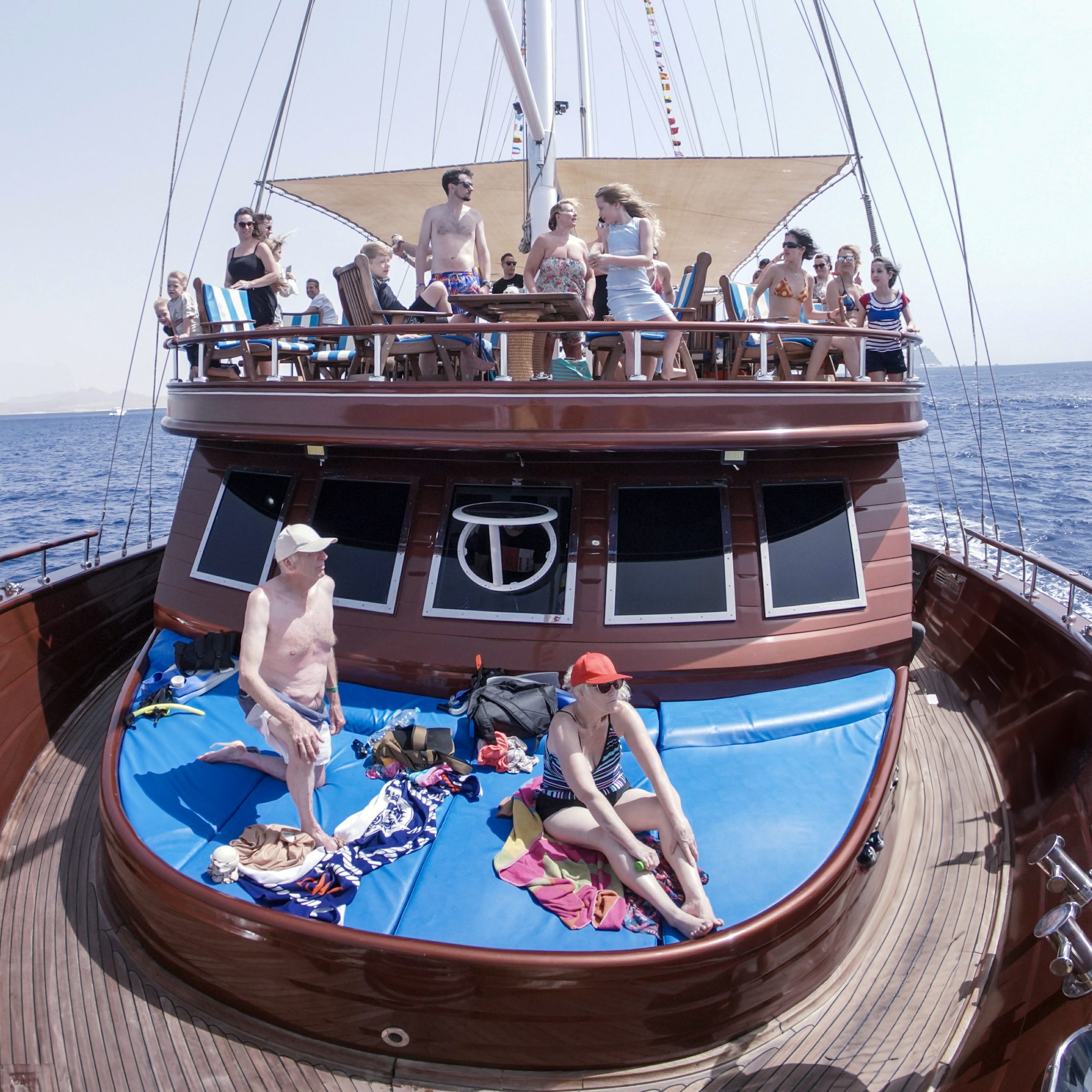 The Pirates yachts are two-masted, wooden vessels that evoke the heyday of sailing. They have a large, air-conditioned top sun deck and two lower deck salons that are lavishly furnished in wood and marble and exquisitely adorned with a pirate motif. Your onboard banquet open buffet lunch is provided in the salon.