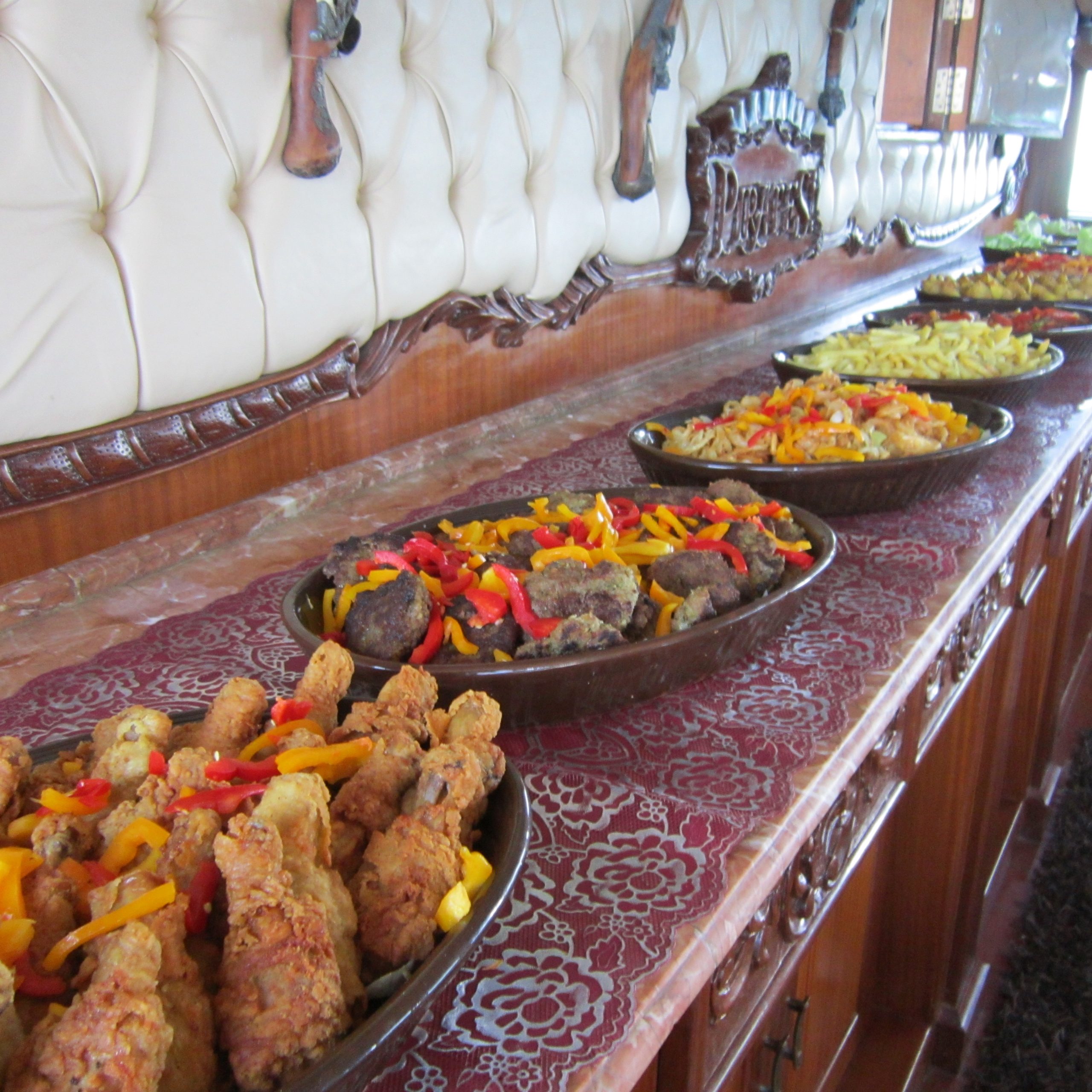 Lunch options include shrimp, calamari, fish, chicken, and kofta; three varieties of fresh salads; rice, pasta, and potatoes; and seasonal fresh fruit.